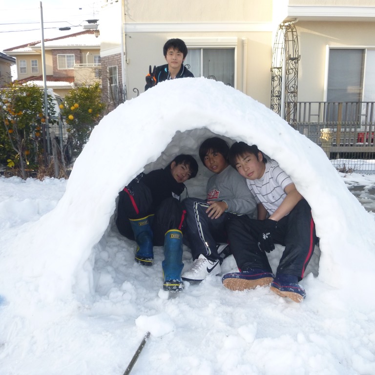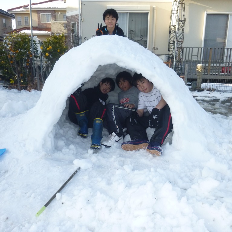 多すぎる雪は公園に集積しました。その雪で子供たちが根性でかまくらを作りました。