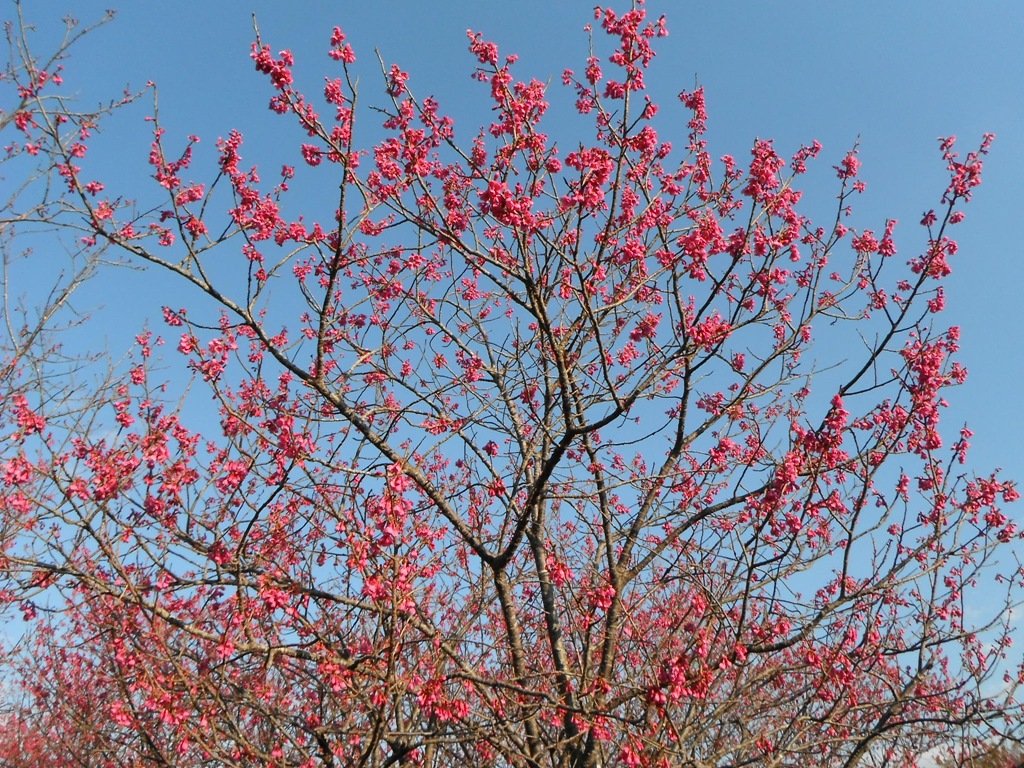 近くのカンヒザクラ畑(生産圃場)にヒヨドリが大群で訪れ花の蜜を食べている。